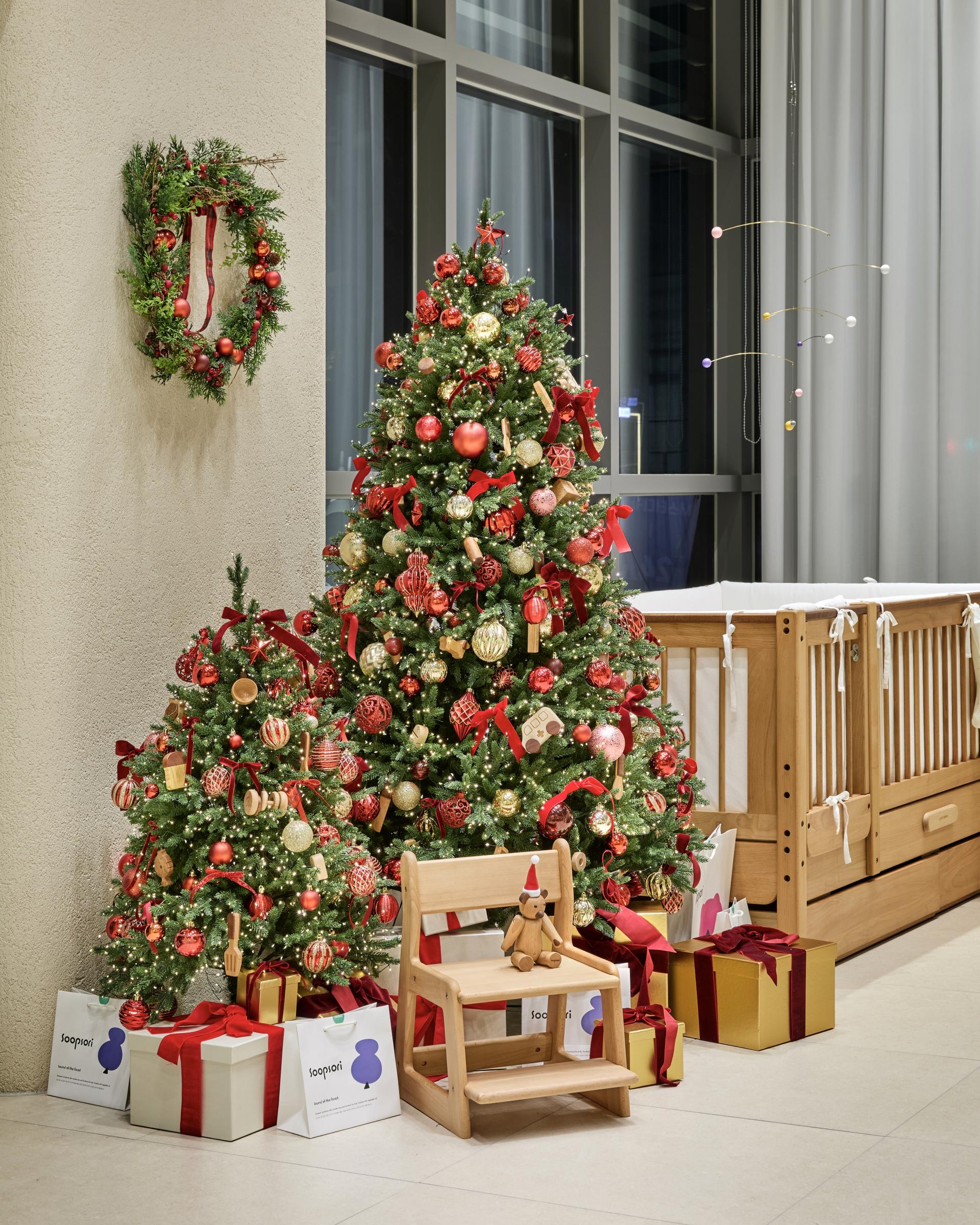 자연광이 부드럽게 스미는 숲소리 스튜디오에 크리스마스 트리와 원목 가구, 작은 오너먼트가 어우러져